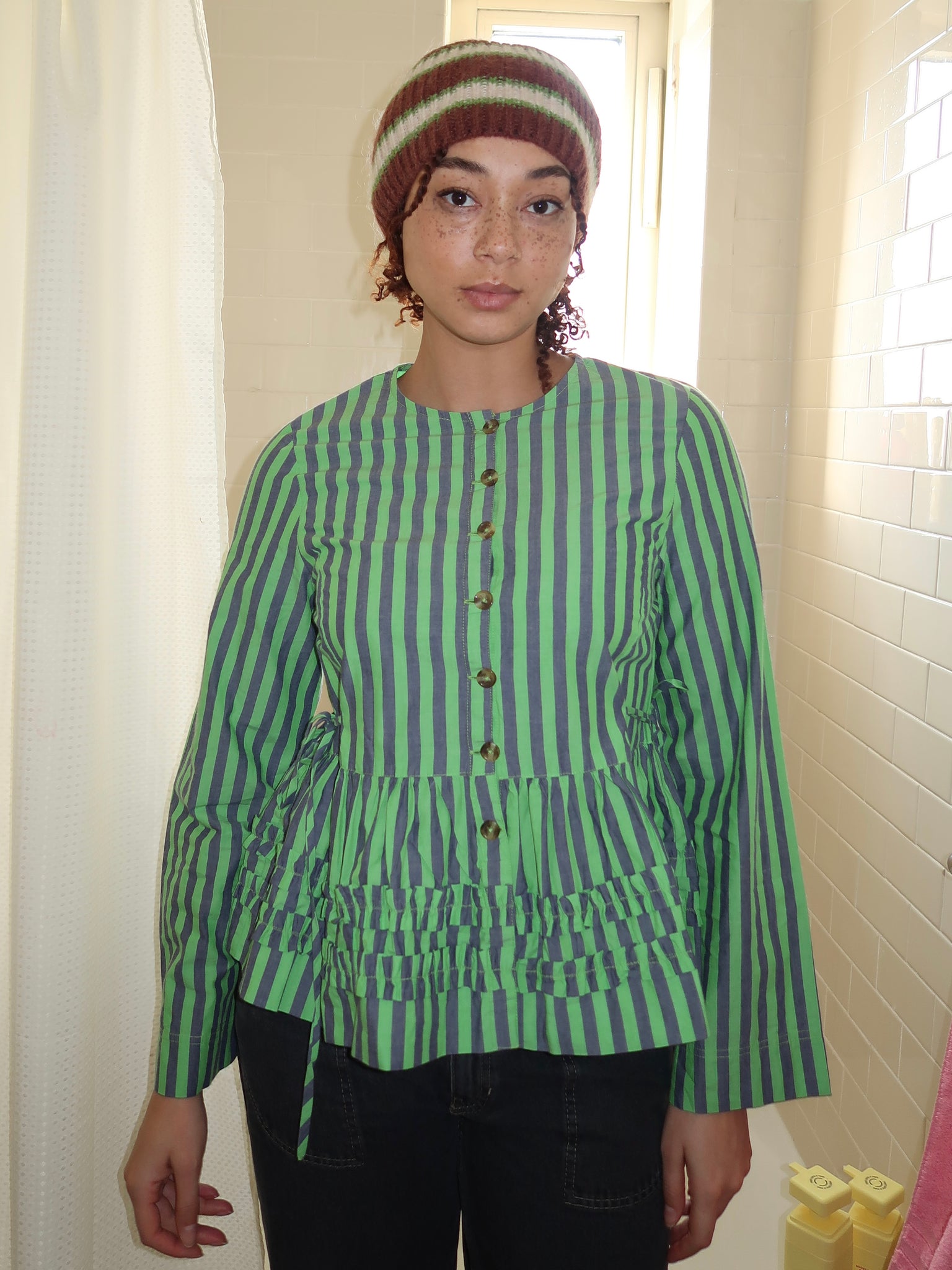 Madison Blouse in Navy Pop Green Stripe